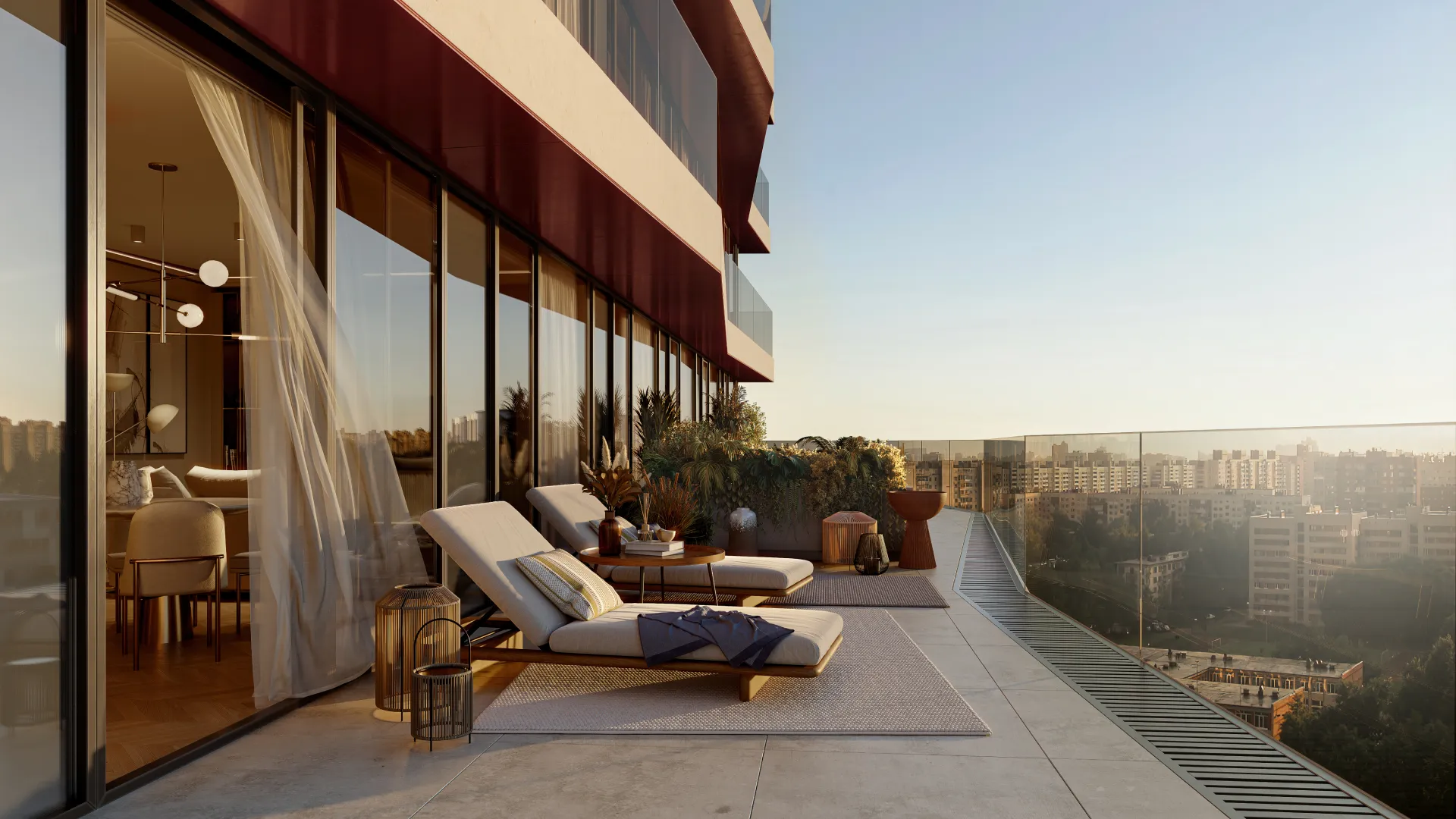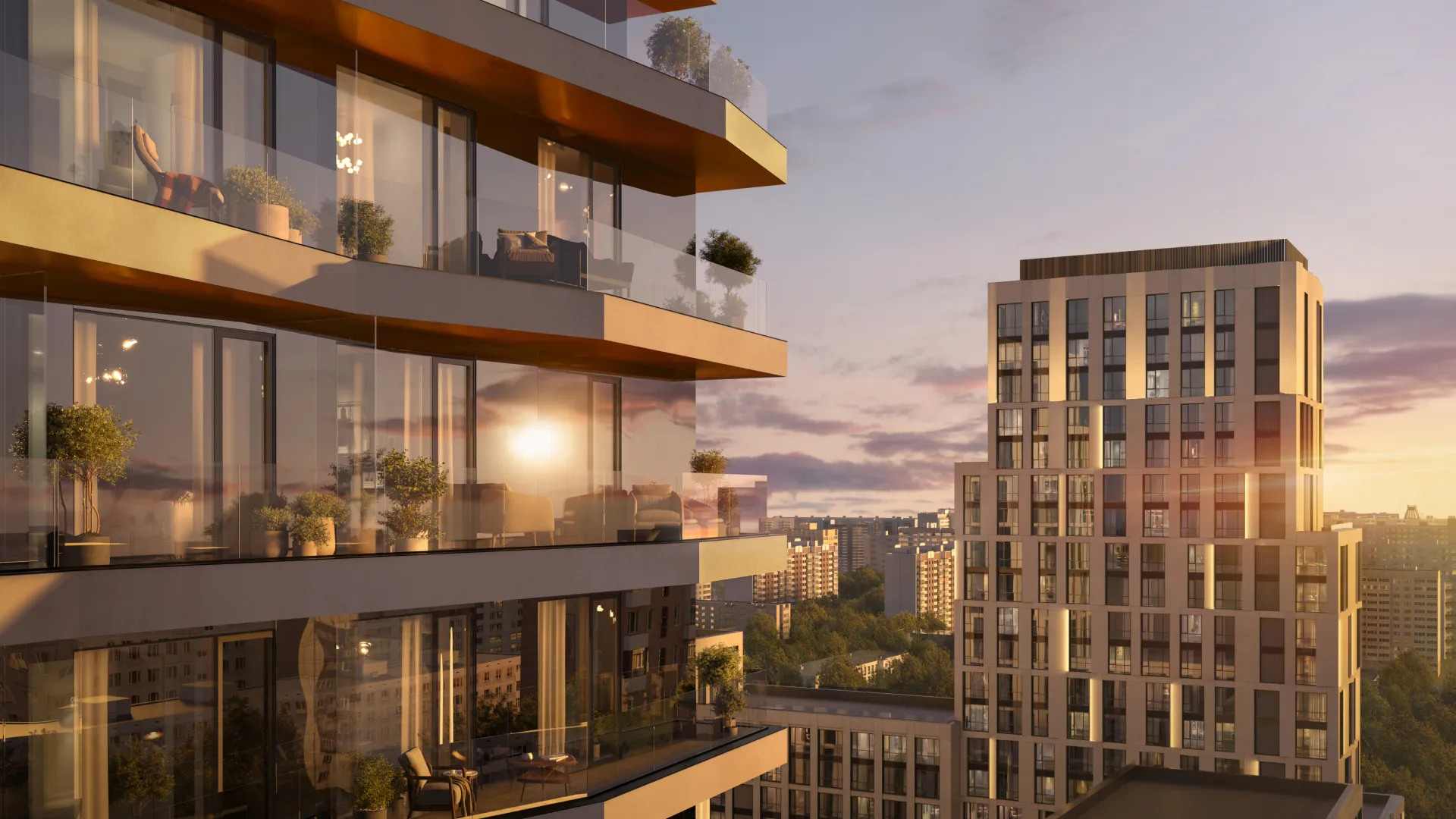 Большие панорамные окна обеспечивают обилие солнечного света в каждой квартире. А закрытый защищенный контур квартала сформирован таким образом, что внутренние зелёные дворы наполнены большим количеством естественного освещения.
