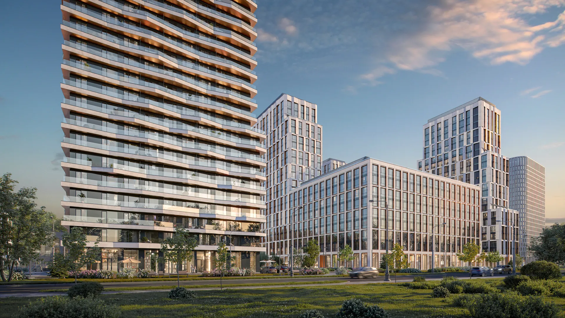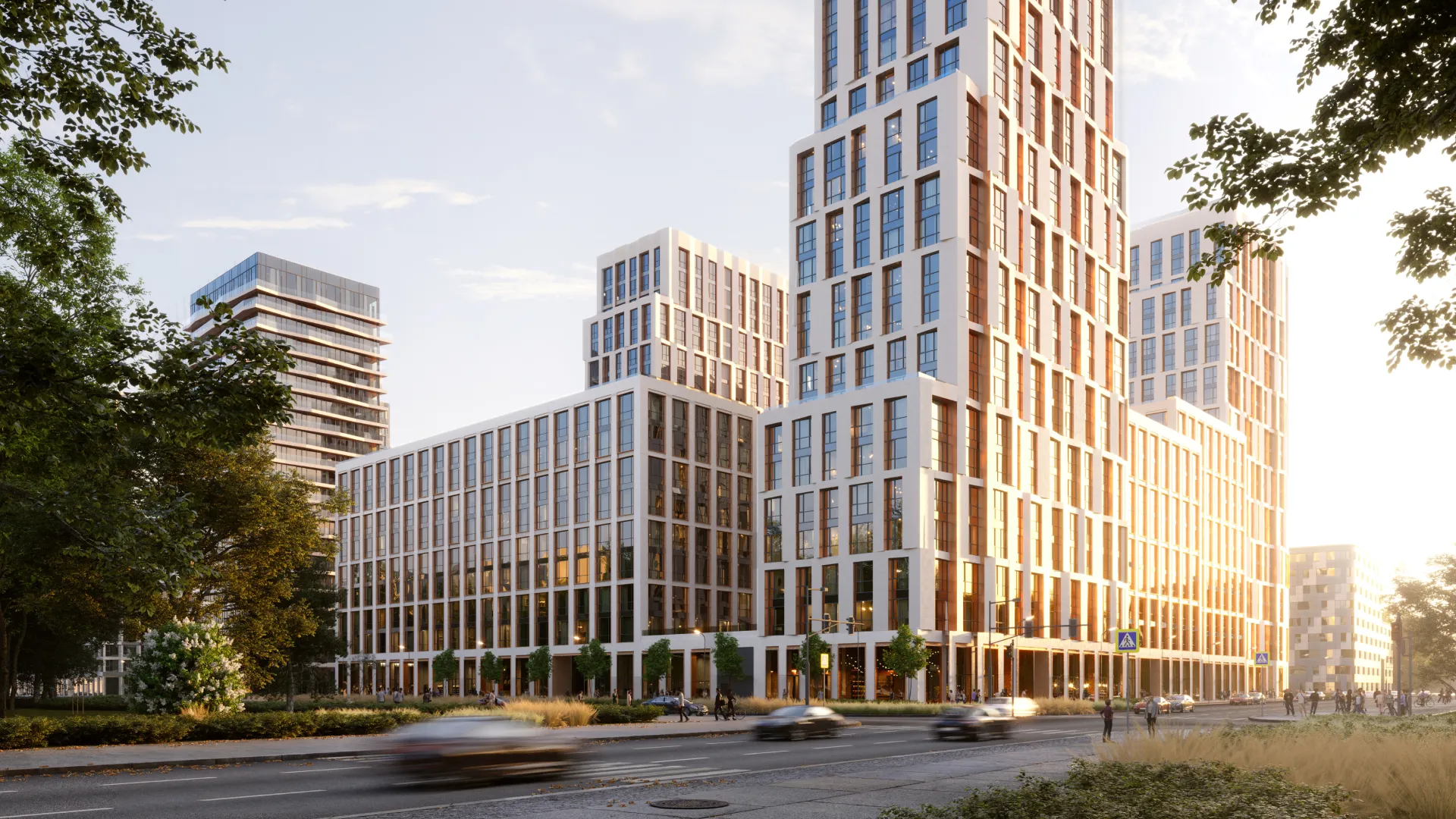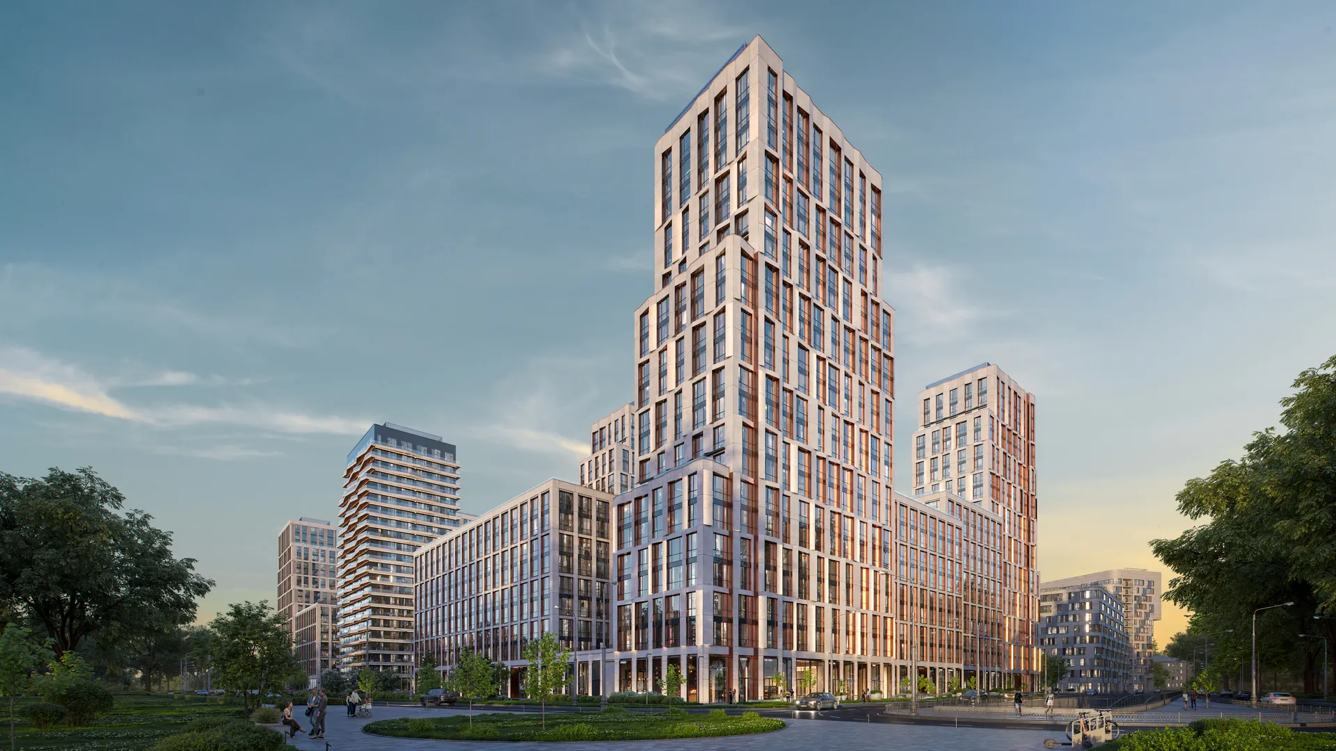 При периметральной застройке переменная этажность дает более сложный силуэт и объем квартала. Авторы концепции разнообразили классическую посадку объемно-пространственной композиции и за счет подсечек создали более динамичный и сложный силуэт. Переменная высотность зданий позволила разнообразить планировочные решения и увеличить количество квартир с террасами.